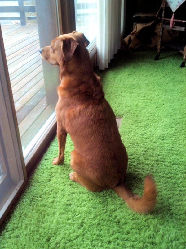 Sophie waiting. She waited for more than 30 minutes before deciding to take a nap so she would be extra ready when they came. It is great to be a hound!