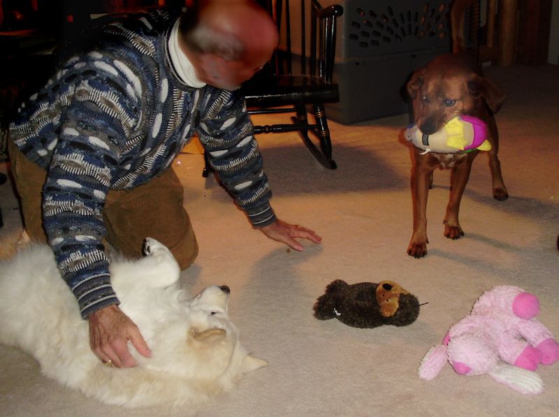 After-work play includes playing tug with toys and racing back and forth doing “bed aerobics.” Bed aerobics involves racing back and forth from the office to the bedroom and leaping onto the bed waiting for us to tap on the bed like a drum. When we do, off she goes, back and forth. When she was young she could make 8 or 10 laps. Usually these days she makes 3 or 4. I am not sure what got into her today but she made so many laps I could not even count them.