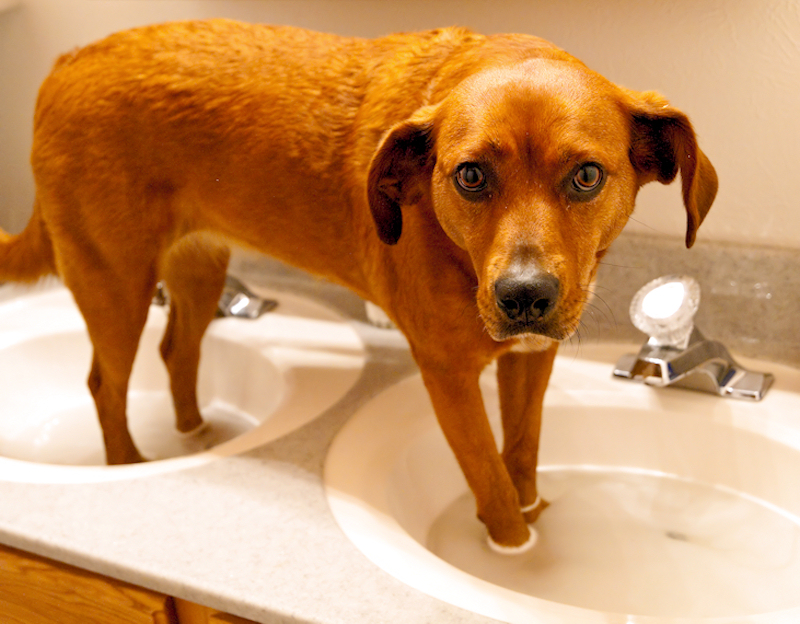 On the day in question I just did not have it in me to make her get into the tub. Home or not, this was a horrible thing. I also did not want to get totally wet and have her slosh around in the tub trying to shake off the soap and water. I looked at her contemplating my options. Her feet were the real problem. The rest I could just wipe off with a damp towel. I looked at my sink and I looked at her feet and inspiration hit. There was something useful about those stupid sinks.