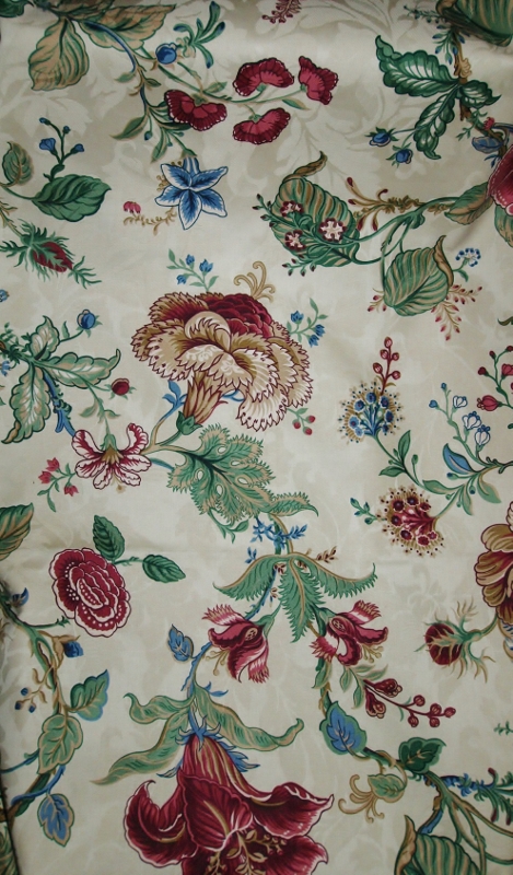 I can repair and reupholster this couch. We are going to have a couch and I don’t have to build the frame. Even better, this one has some very interesting and graceful lines to it. The back is styled in what could be converted to the Empire style furniture (c 1800-1815). While my spouse was retrieving the couch I went in search of fabric having never seen the couch. I tried to focus my interest on the lower priced fabrics thinking this was a temporary couch. I kept ending up in the aisle where the beautiful Waverly cotton and linen fabrics were. These fabrics are made from antique patterns and the threads and printing quality is perfection. Some of them cost $65 a yard and a few cost more. I averted my eyes. I took myself out of the area and gave myself a good talking to. About that time my eyes fell on a sale tag. The fabrics were all 40% off. It took me a long time to settle on the fabrics I wanted. I wanted all of them. I brought home three.