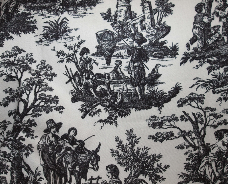 I also found a beautiful taupe-background black figured toile. Dating from 1760-1770, toile fabric prints depict romanticized, idallic country side endeavors of the elate in the mid 18th century. This fabric, also called the Fabric of Jouyy documents activities of the privileged that took place around the Palace of Versailles in the years leading to the French Revolution. It was first produced using wood blocks in France and later by copper plates in England. The fabric, which can be cotton or linen, is composed of small vignettes of the elite playing in the countryside. Milkmaids and farmers can be found but the fabric implies they were playful, dressed revealingly and their work was simple.