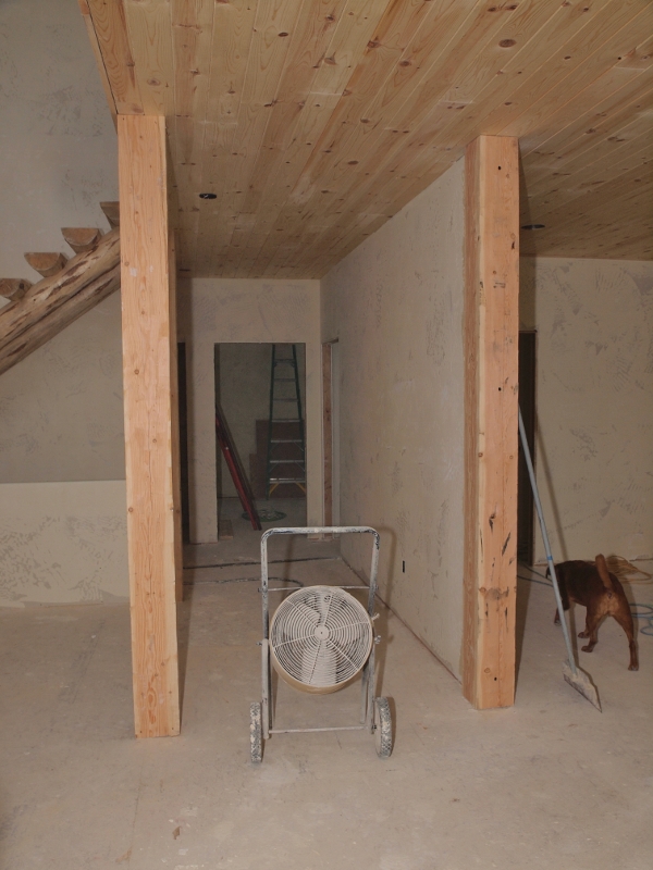 The posts define the areas of the great room. There is a post right at the edge of the top of the stairs. When you walk into the front door your eye is drawn to that posts and the one shown in the front of the photo with the fan in it. That is the visual entry. The wall to the right is what we call our gallery wall. Things we find engsgin or beautiful will sit on that wall. Not evertyhing will stay for ever. Some things will stay a few days before passing and others will stay briefly and go back out into the world. It will be a wall of beauty that delights.