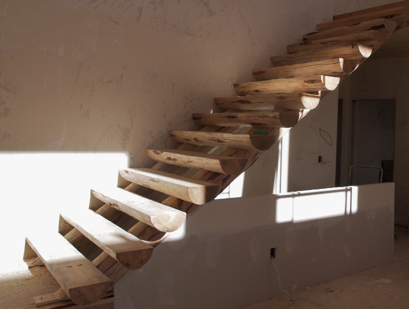 Today we got our first three floor boards. They are not long, only 42″. The boards were laid on the landing at the bottom of the 10″ log stairs. I realized that there were only 3 and a part of a 4th board. As my eye traveled upwards I saw a pattern.