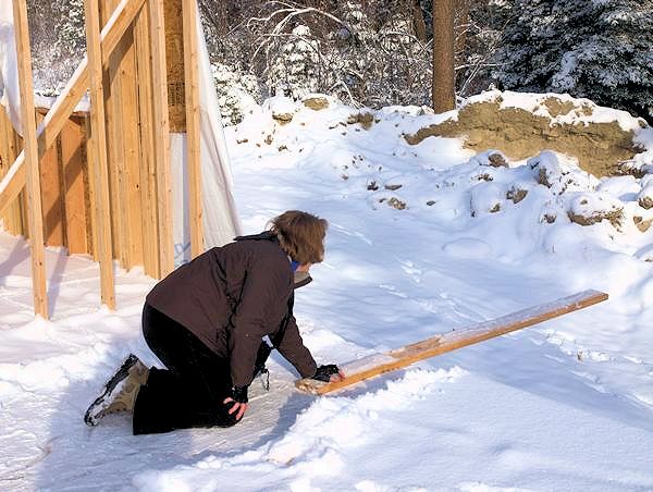 Me, bundled in winter clothes against the November below zero temperatures, trying to get a visual feeling for how far the lean to kitchen will stick out.